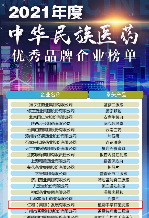 2022年12月30日,2021年度中華民族醫藥優秀品牌企業榜單發布!仁和連續6年入選該榜單,今年位列榜單第17位,比上年前進8位。